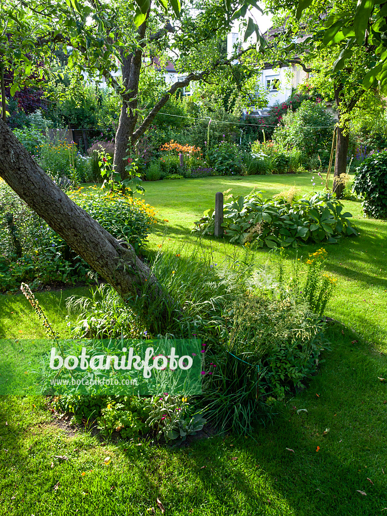 Reihenhausgarten mit Rasenfläche und Obstbäumen