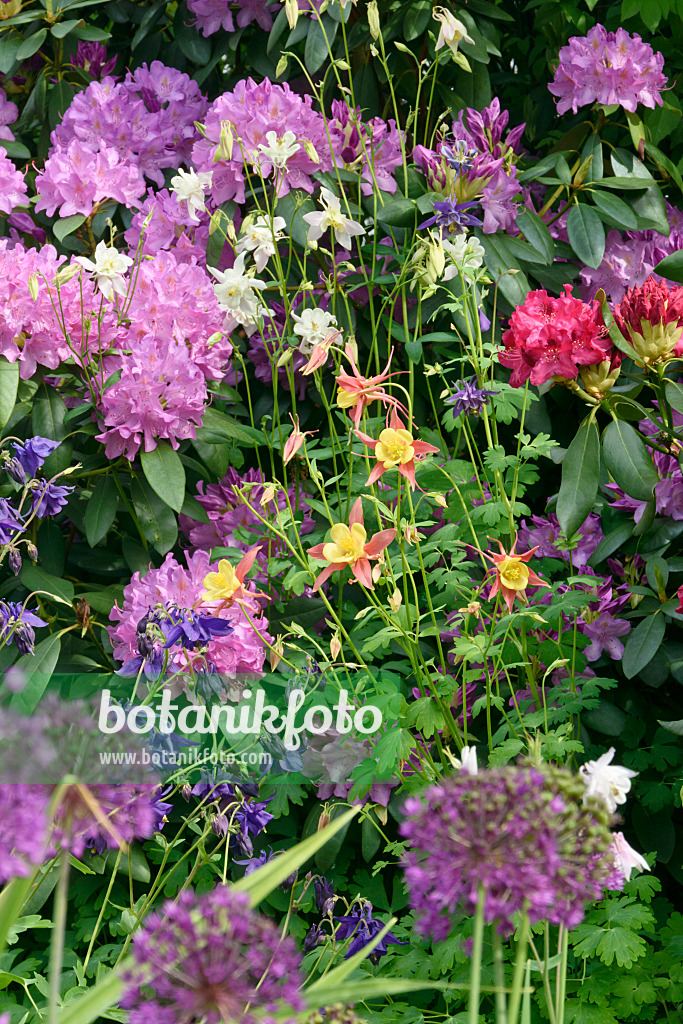 Rhododendren (Rhododendron), Akeleien (Aquilegia) und Zierlauch (Allium)