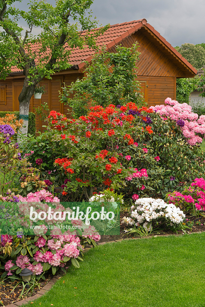 Rhododendren (Rhododendron) vor einem Gartenhaus