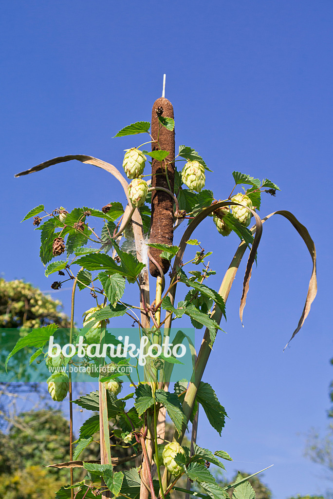 Rohrkolben (Typha) und Gewöhnlicher Hopfen (Humulus lupulus)
