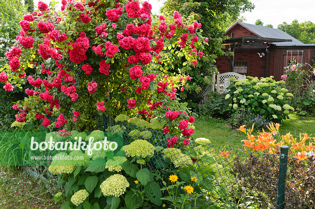 Rosen (Rosa), Hortensien (Hydrangea) und Taglilien (Hemerocallis) in einem Kleingarten