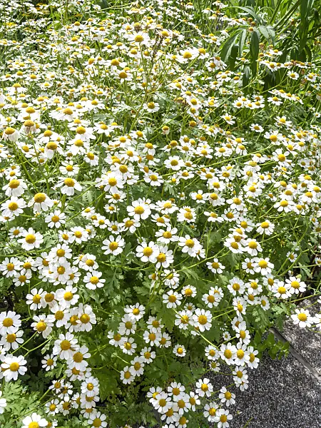 Rosen (Rosa The Fairy) und Mutterkraut (Tanacetum parthenium)