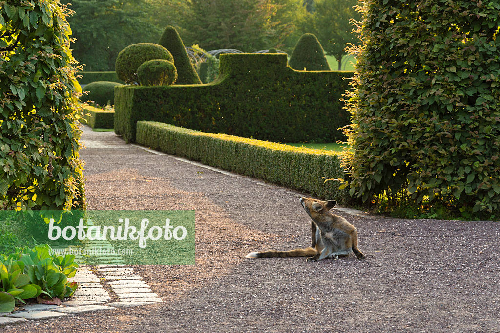 Rotfuchs (Vulpes vulpes) putzt sich, Britzer Garten, Berlin, Deutschland