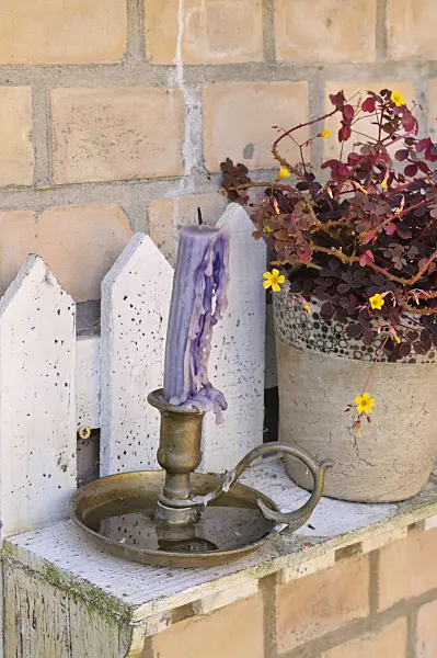 Sauerklee (Oxalis vulcanicola) mit Dekoration auf einem Wandregal