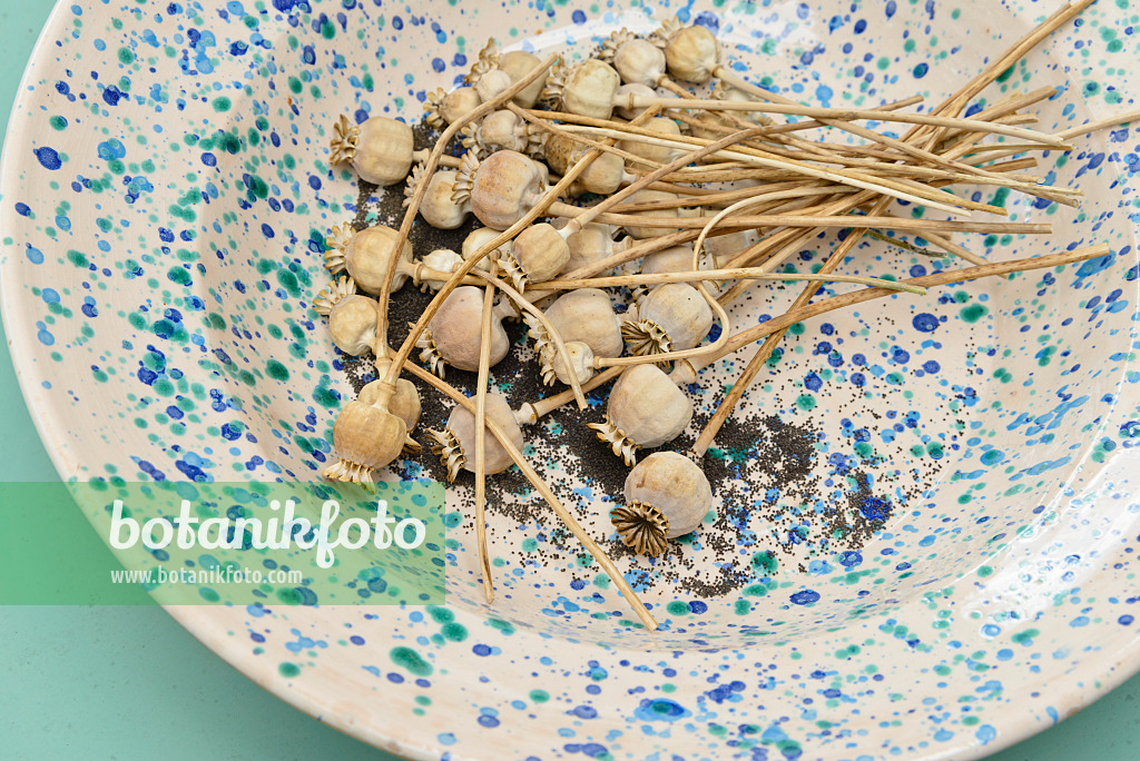 Schlafmohn (Papaver somniferum) - Samenkapseln auf einem Teller