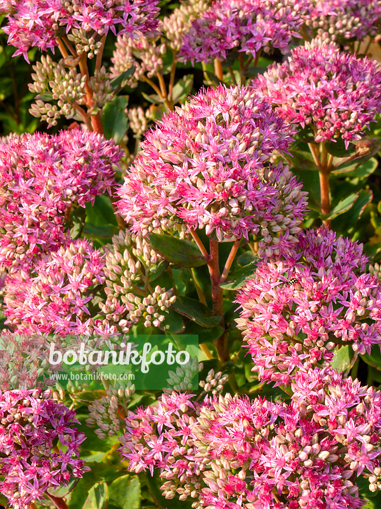 Sedum spectabile, auch bekannt als Pracht-Fetthenne, ist eine sukkulente Staude aus der Familie der Crassulaceae. Sie blüht von August bis Oktober mit rosa oder weißen Blüten und zieht Bienen und Schmetterlinge an. Die Pflanze bevorzugt sonnige Standorte und trockene, durchlässige Böden. Sie ist winterhart und pflegeleicht, ideal für Steingärten oder Trockenmauern.
