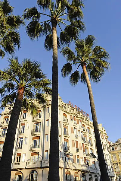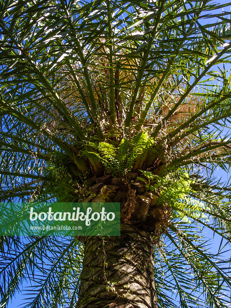 Silberdattelpalme (Phoenix sylvestris) mit mächtigem Stamm und weitgefächerter Krone vor blauem Himmel