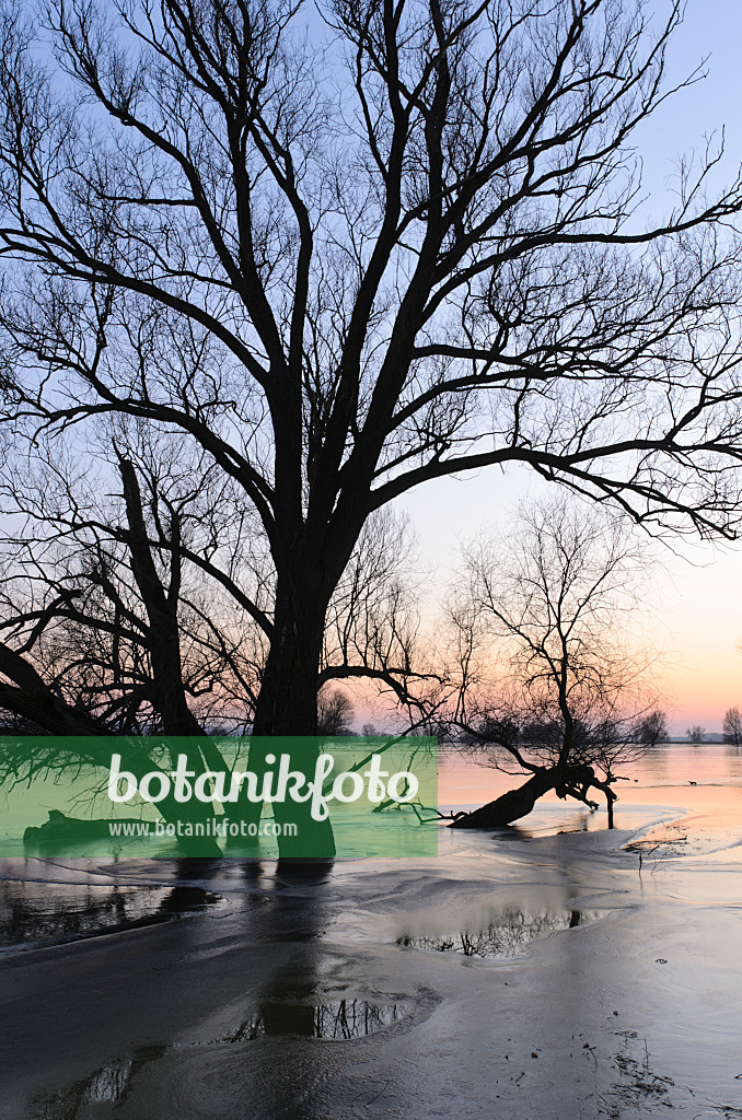 Silberweide (Salix alba) auf einer überfluteten und gefrorenen Polderwiese, Nationalpark Unteres Odertal, Deutschland