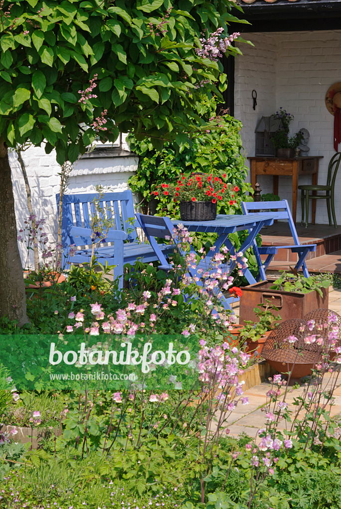 Sitzplatz mit blauen Möbeln vor einem weißem Haus