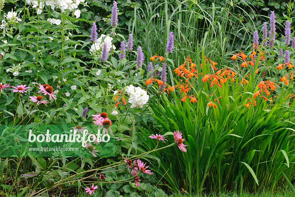 Sonnenhut (Echinacea purpurea), Staudenphlox (Phlox paniculata), Anis-Riesenysop (Agastache foeniculum) und Montbretie (Crocosmia masoniorum)