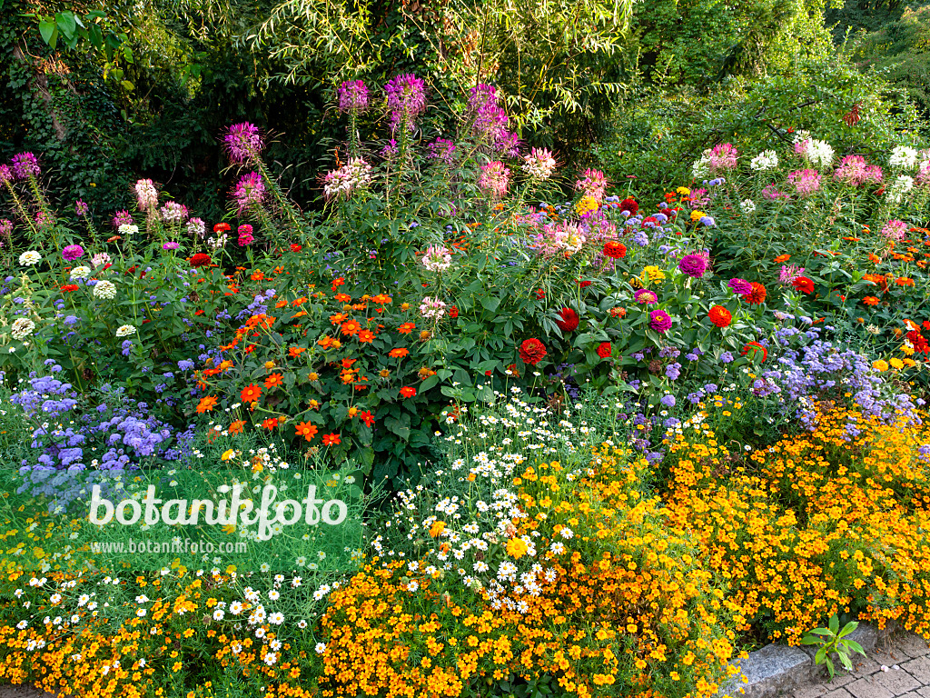 Spinnenblumen (Tarenaya syn. Cleome), Zinnien (Zinnia), Leberbalsam (Ageratum) und Studentenblumen (Tagetes)