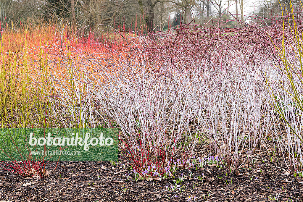 Tangutische Himbeere (Rubus cockburnianus) und Seidiger Hartriegel (Cornus sericea 'Budd's Yellow' syn. Cornus stolonifera 'Budd's Yellow')