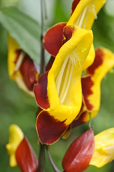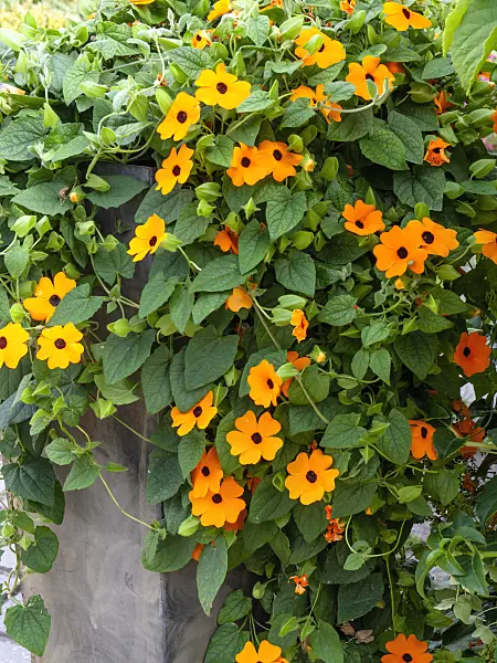 Thunbergie (Thunbergia gregorii syn. Thunbergia gibsonii) an einer Steinmauer