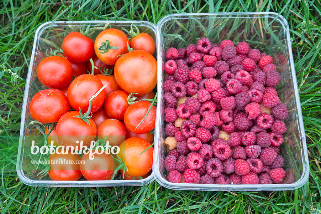 Tomaten (Lycopersicon esculentum) und Himbeeren (Rubus idaeus)