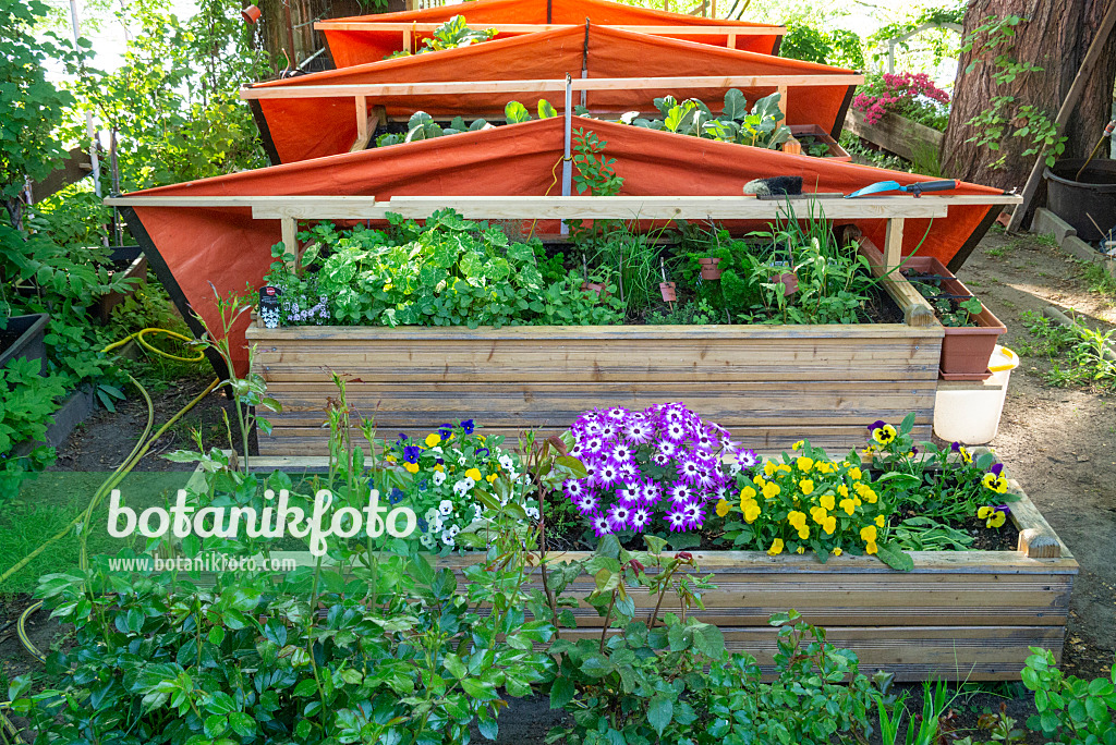 Veilchen (Viola) und Zinerarie (Pericallis) in Hochbeeten
