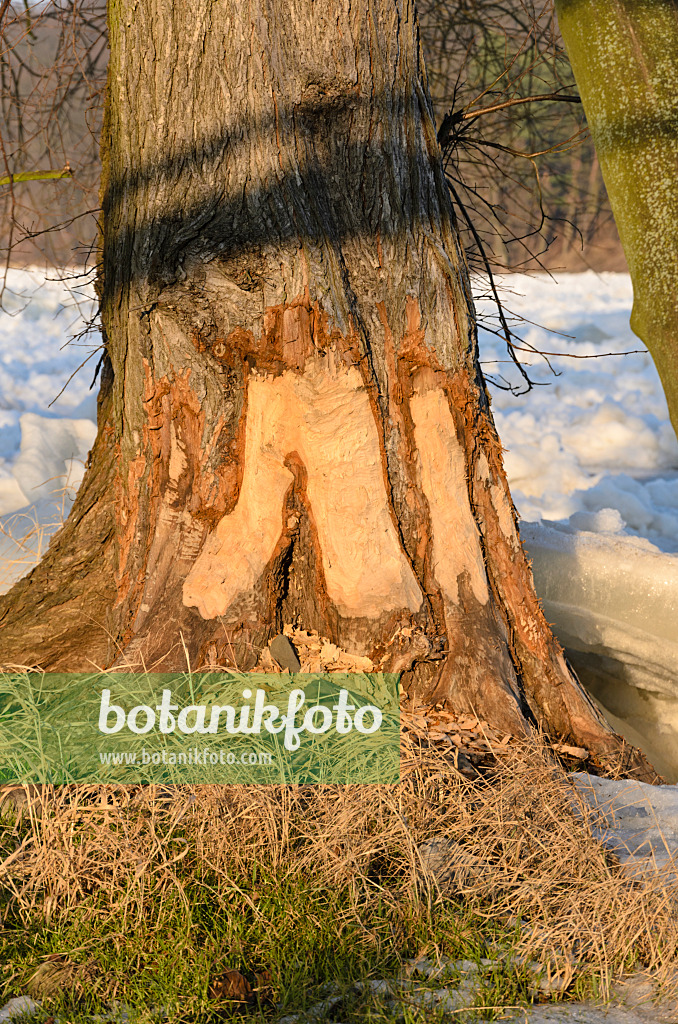 Von Bibern angenagte Bäume an der gefrorenen Oder, Nationalpark Unteres Odertal, Deutschland