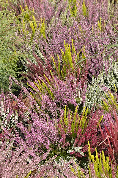 Waldreitgras (Calamagrostis arundinacea var. brachytricha syn. Achnatherum brachytricha), Mexikanisches Berufkraut (Erigeron karvinskianus) und Besenheide (Calluna vulgaris) in Töpfen