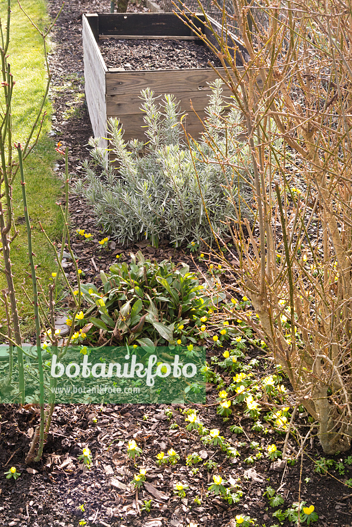 Winterlinge (Eranthis hyemalis) in einem Garten mit Hochbeet