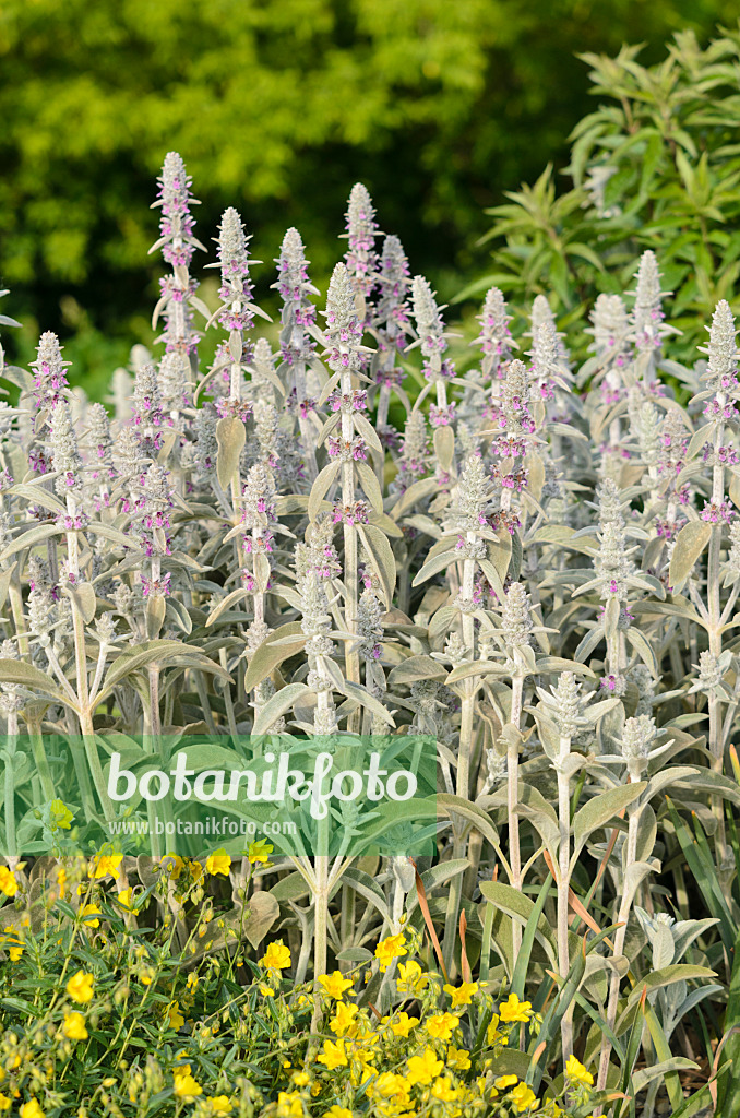 Stachys byzantina, auch als Wollziest bekannt, ist eine mehrjährige Staude mit silbrig behaarten, weichen Blättern. Sie blüht im Sommer mit rosa-violetten Blüten und bevorzugt sonnige Standorte mit durchlässigem Boden. Ideal für Steingärten oder als Bodendecker, da sie trockenheitsresistent ist.