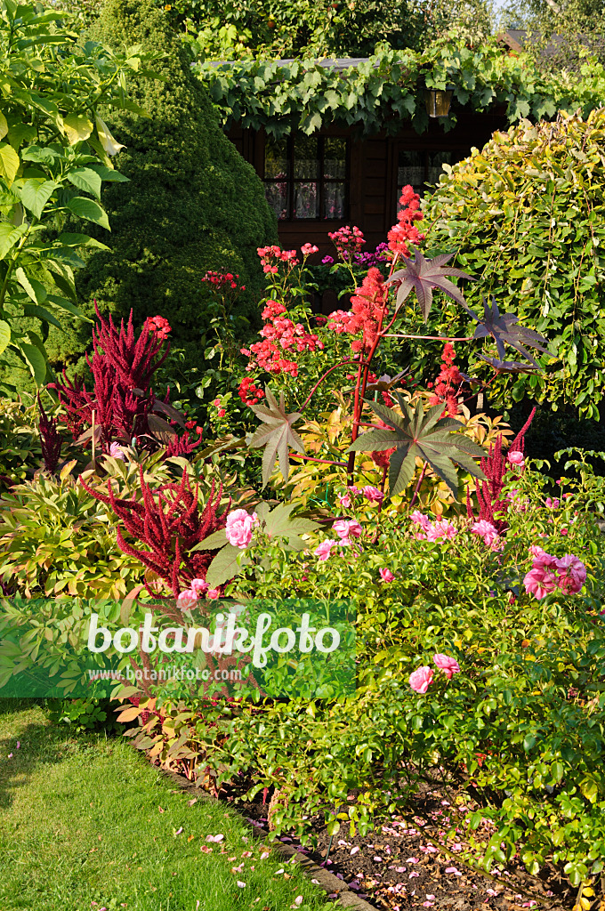 Wunderbaum (Ricinus communis), Gartenfuchsschwanz (Amaranthus caudatus) und Rose (Rosa)