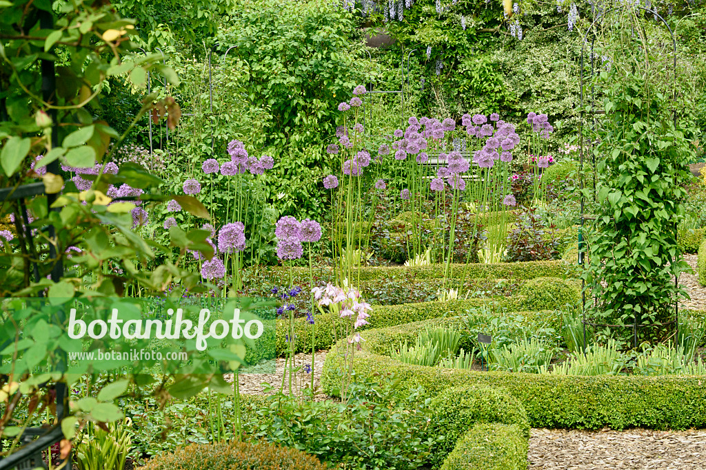 Zierlauch (Allium) und Buchsbäume (Buxus) in einem Rosengarten