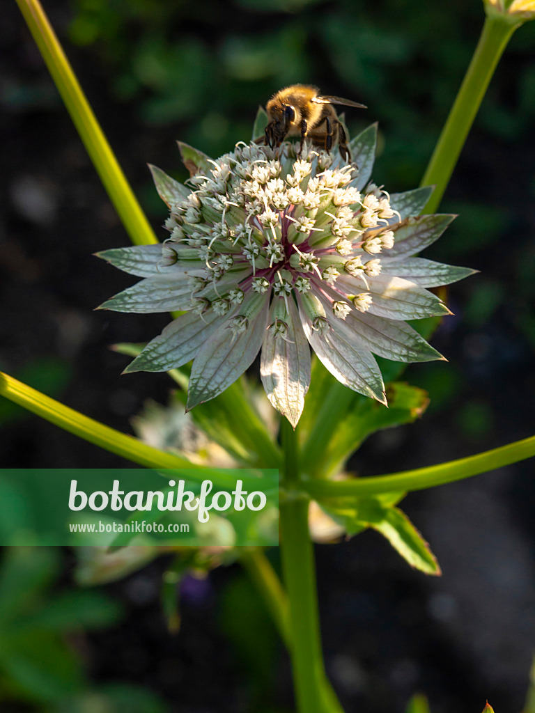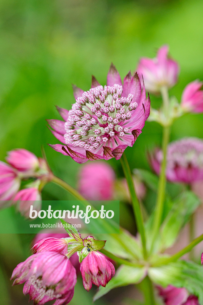 Große Sterndolde (Astrantia major), Brennende Liebe (Lychnis chalcedonica syn. Silene chalcedonica), Hoher Rittersporn (Delphinium elatum) und Rosen (Rosa)