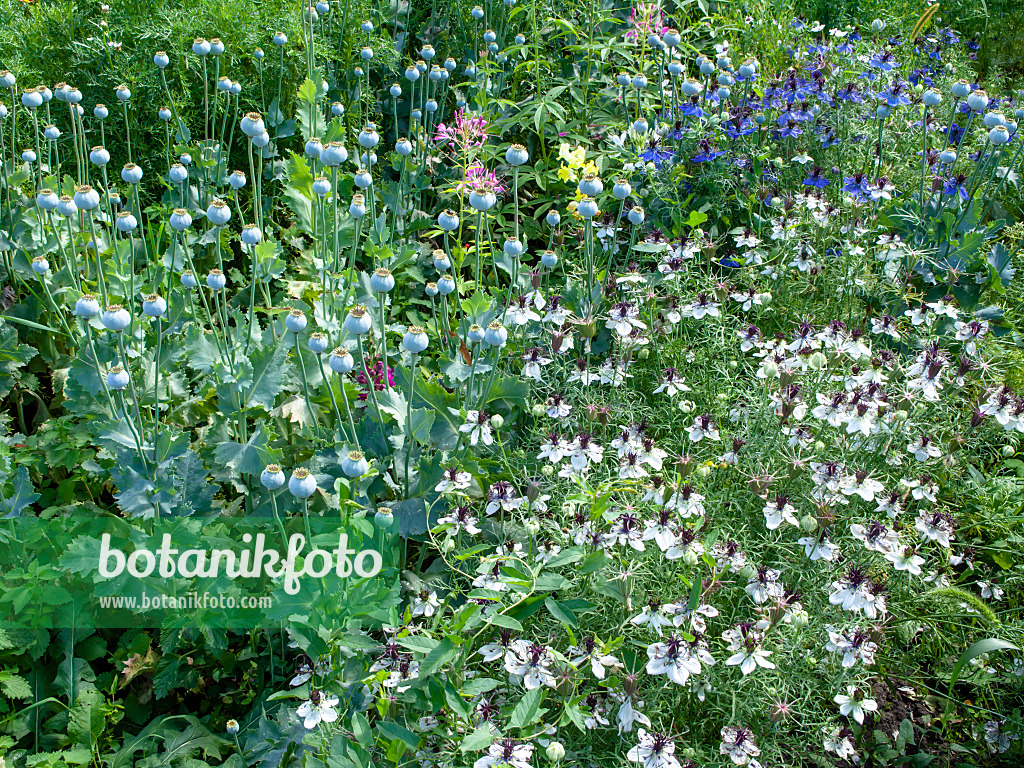 Schlafmohn (Papaver somniferum) und Jungfer im Grünen (Nigella damascena)