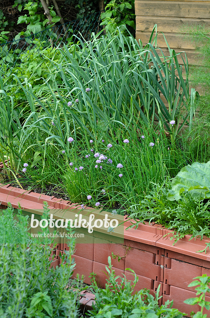 Schnittlauch (Allium schoenoprasum) und Küchenzwiebel (Allium cepa) in einem Hochbeet