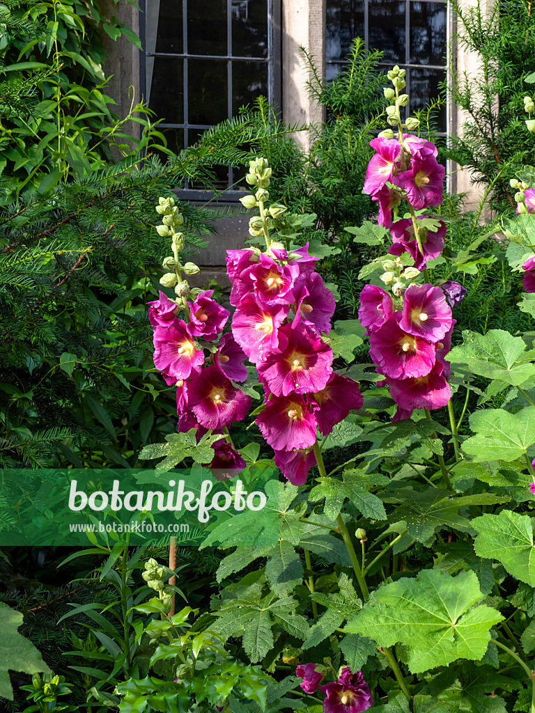 Alcea rosea, auch Stockrose genannt, ist eine beliebte Gartenpflanze aus der Familie der Malvengewächse. Sie wird bis zu 2 Meter hoch und blüht von Juli bis September in verschiedenen Farben wie Rosa, Weiß, Gelb oder Dunkelrot. Die Pflanze bevorzugt sonnige Standorte und nährstoffreiche Böden. Sie ist zweijährig und zieht Bienen und Schmetterlinge an. Stockrosen sind pflegeleicht, können aber von Malvenrost befallen werden.