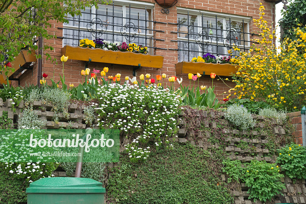 Tulpen (Tulipa), Veilchen (Viola), Schleifenblumen (Iberis) und Ranunkelstrauch (Kerria japonica 'Pleniflora')