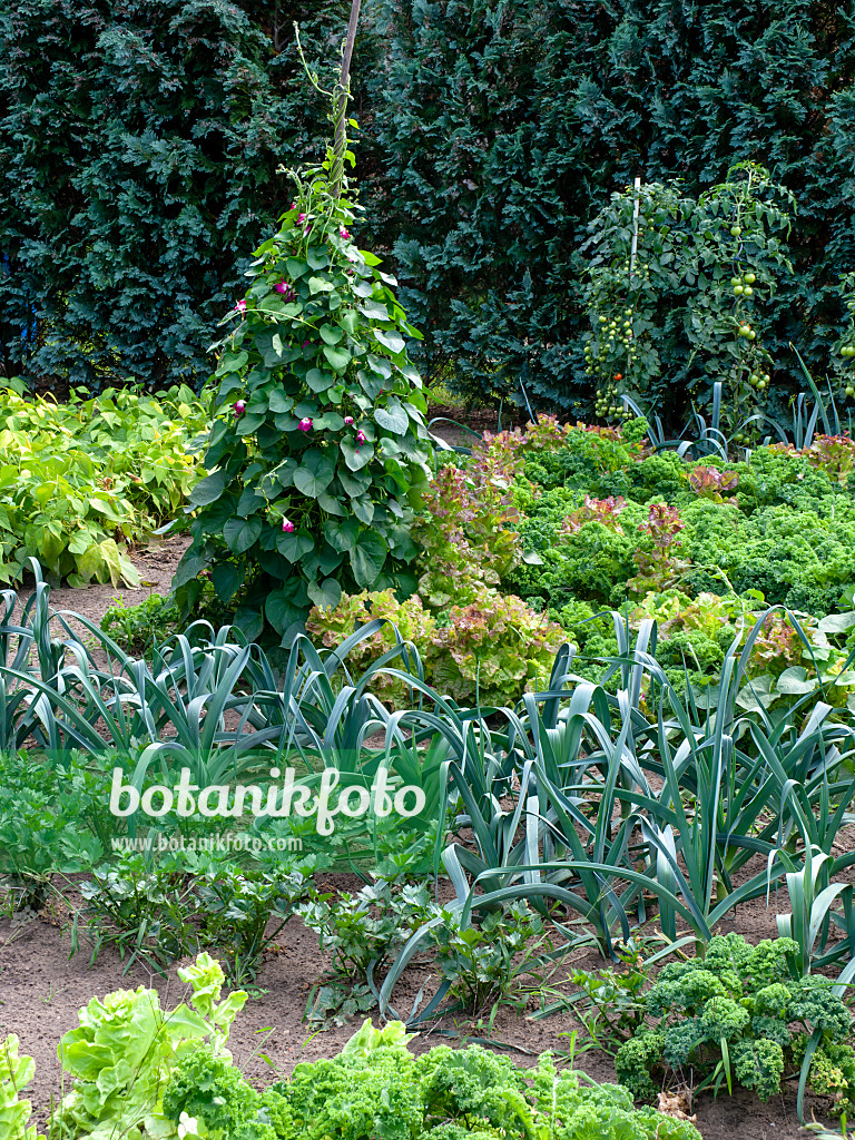 Rotkohl (Brassica oleracea var. capitata f. rubra), Studentenblume (Tagetes patula 'Sunburst Orange') und Grüne Bohne (Phaseolus vulgaris)