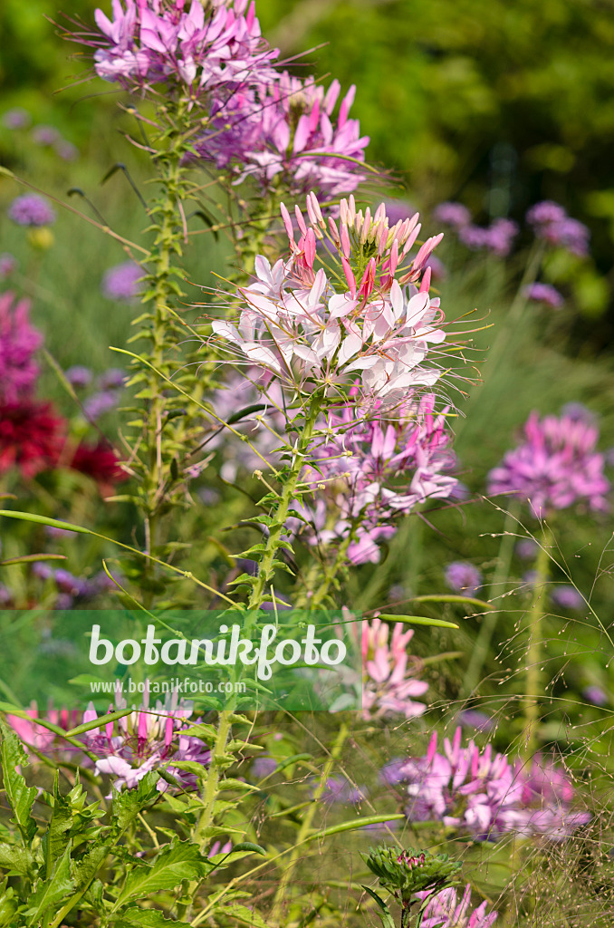 Spinnenblumen (Tarenaya syn. Cleome), Leberbalsam (Ageratum) und Dahlien (Dahlia)