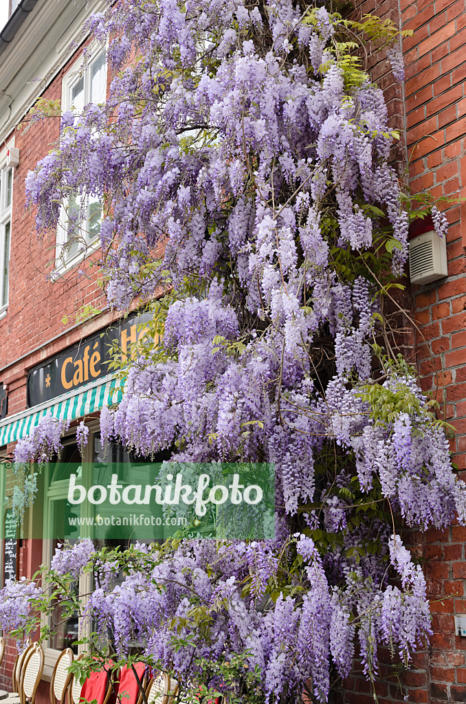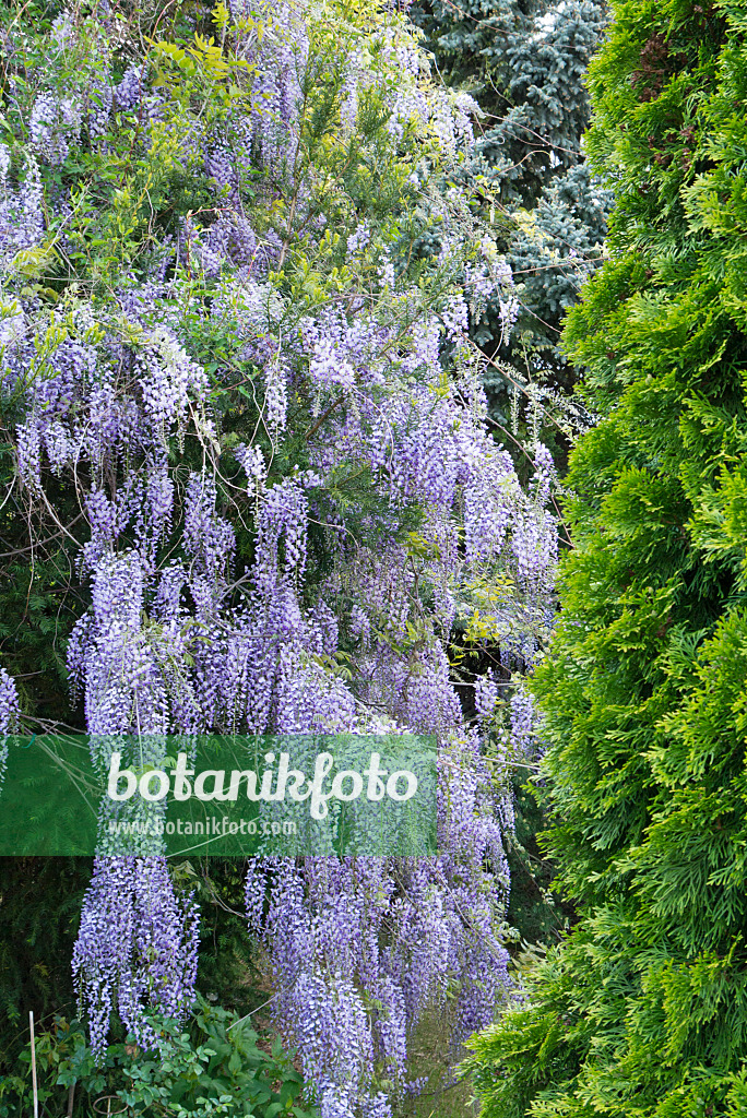 Bergwaldrebe (Clematis montana) und Blauregen (Wisteria)
