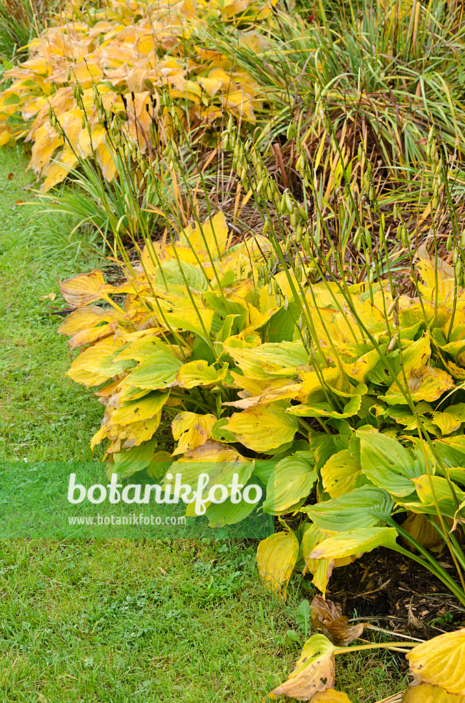 Frauenmantel (Alchemilla), Funkie (Hosta) und Steife Segge (Carex elata 'Bowles Golden')