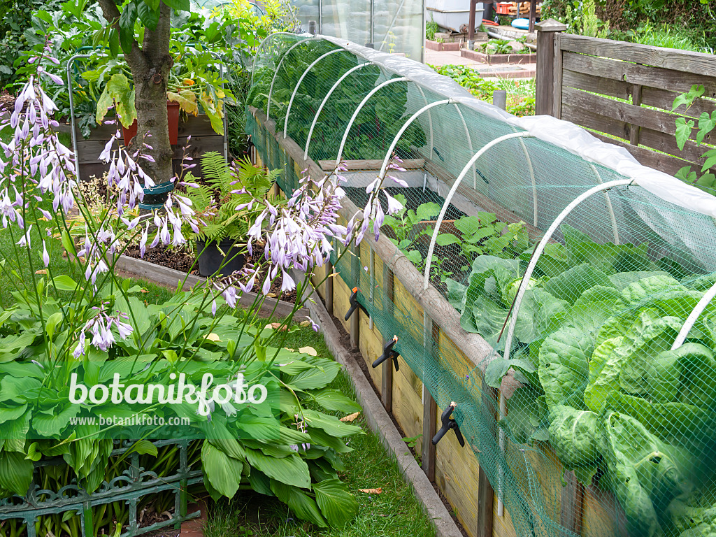 Funkie (Hosta) mit Hochbeet in einem Kleingarten