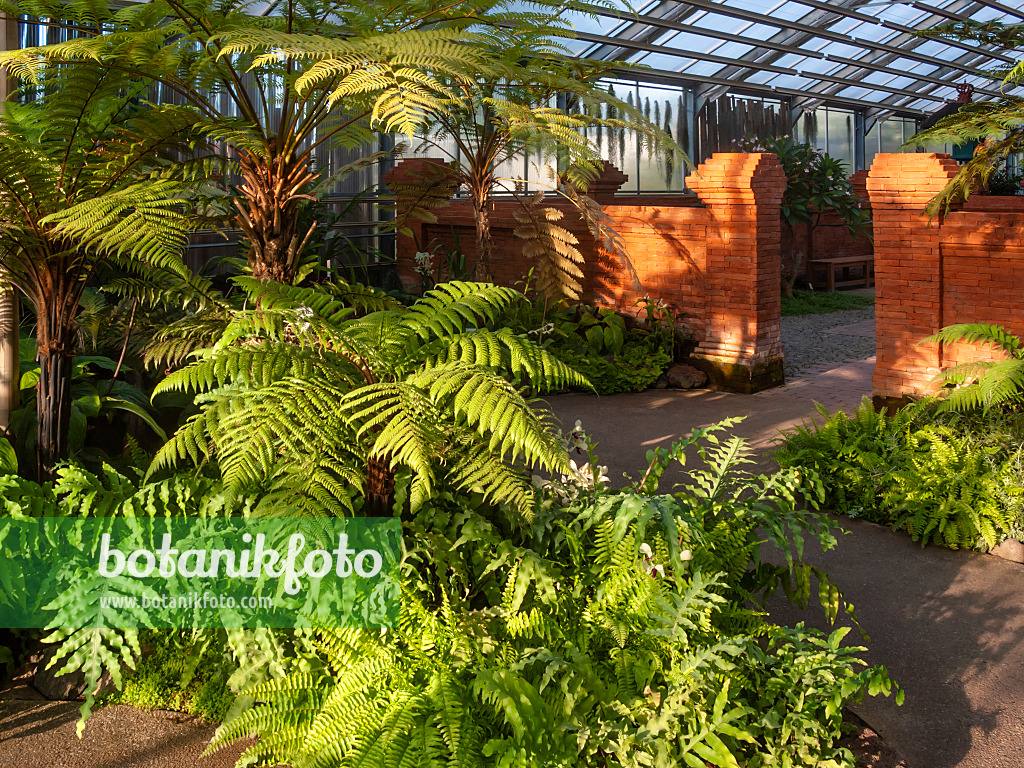 Verschiedene Farne zwischen roten Mauern, Balinesischer Garten, Erholungspark Marzahn, Berlin, Deutschland