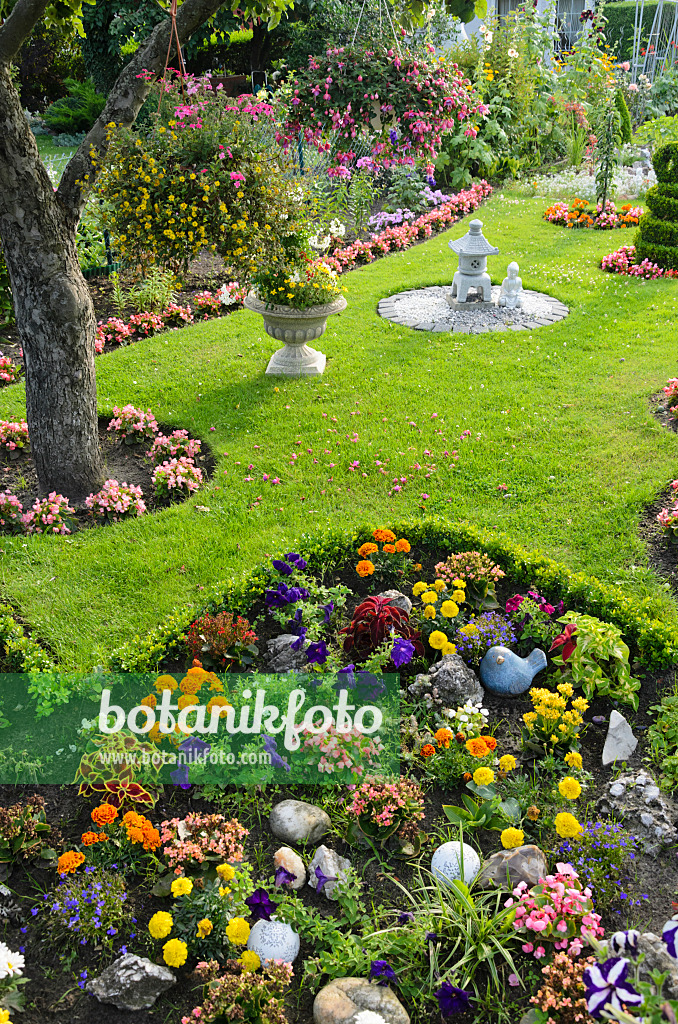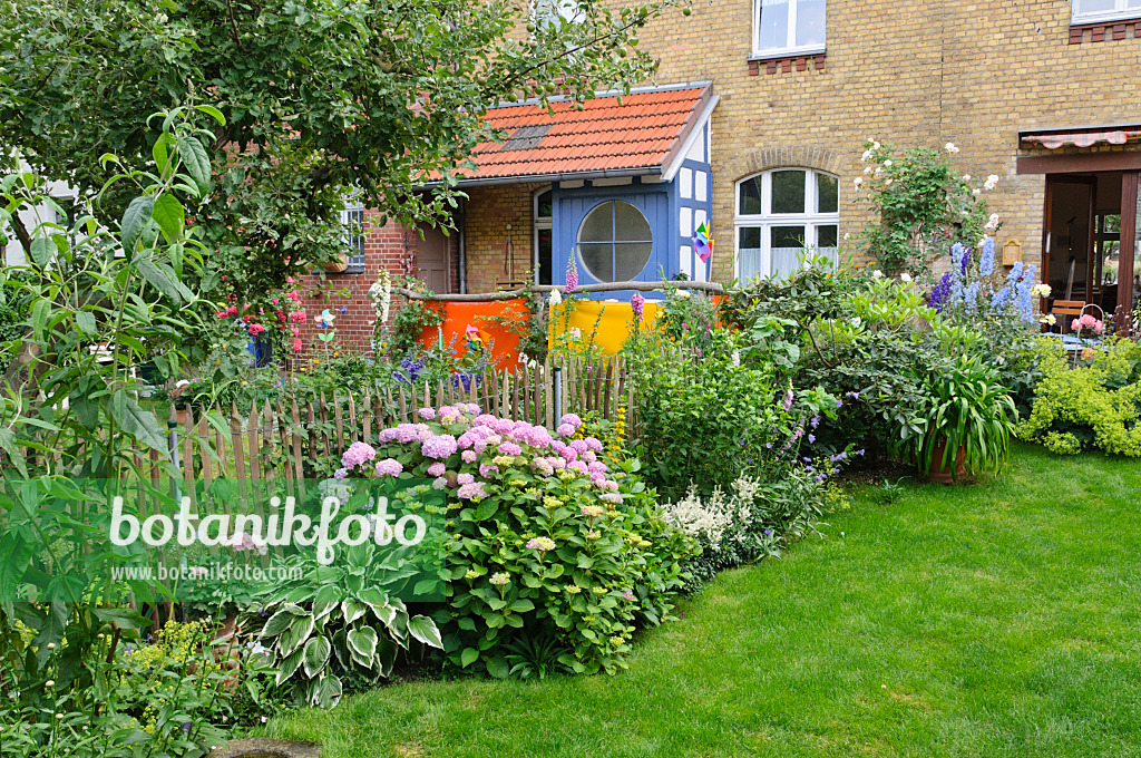Zierlauch (Allium) und Rhododendren (Rhododendron) in einem Kleingarten
