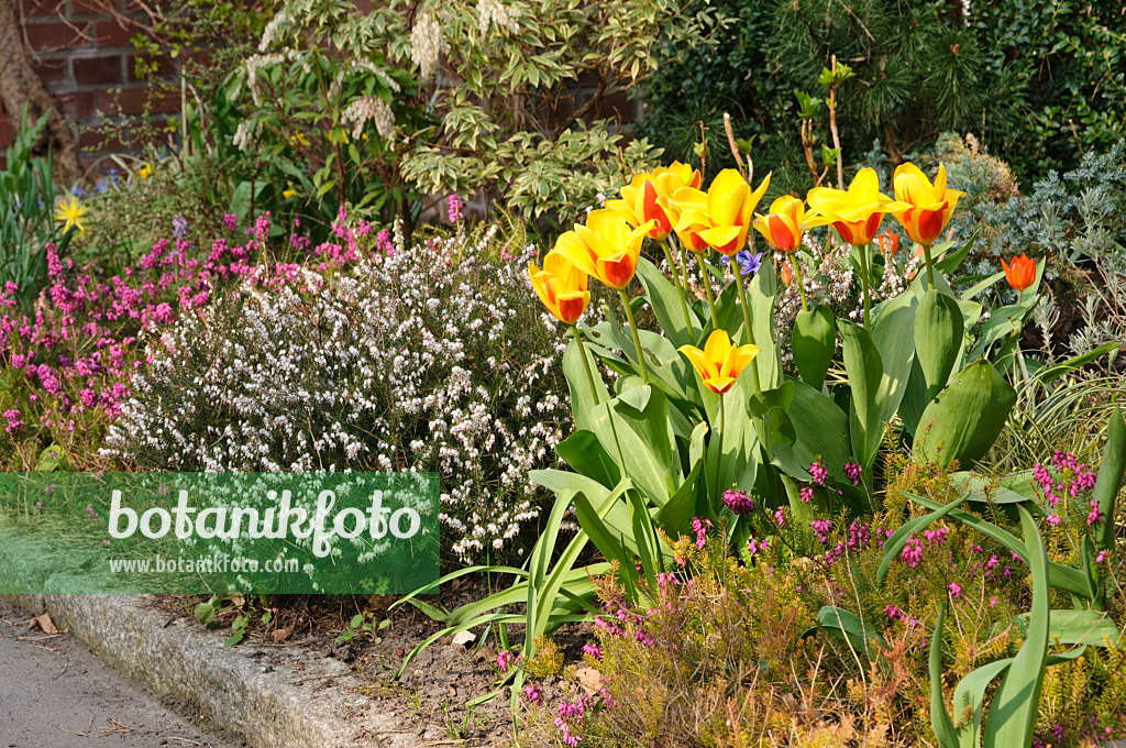 Forsythien (Forsythia) und Buchsbäume (Buxus) in Kugelform
