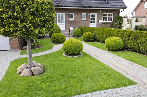 Formaler Vorgarten mit Rasenfläche und Buchsbaum