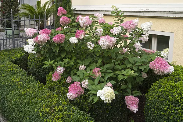 Rispenhortensie (Hydrangea paniculata) und Buchsbaum (Buxus)