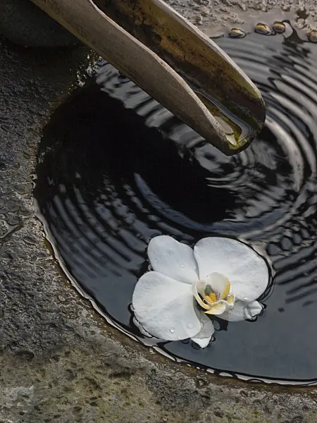 Herbstanemone (Anemone hupehensis var. japonica) mit Wasserspielen in einem orientalischen Garten