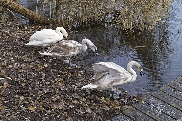 Höckerschwäne (Cygnus olor) auf einem gefrorenen See, Naturschutzgebiet Karower Seen, Berlin, Deutschland