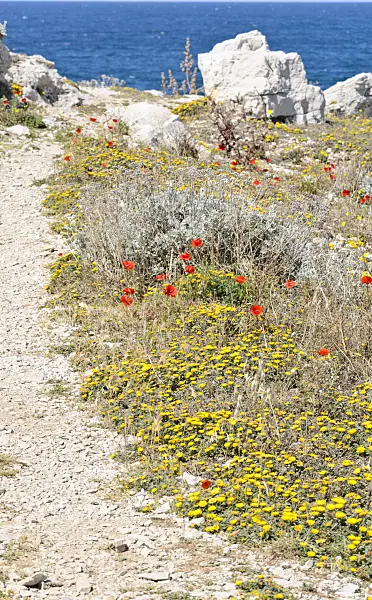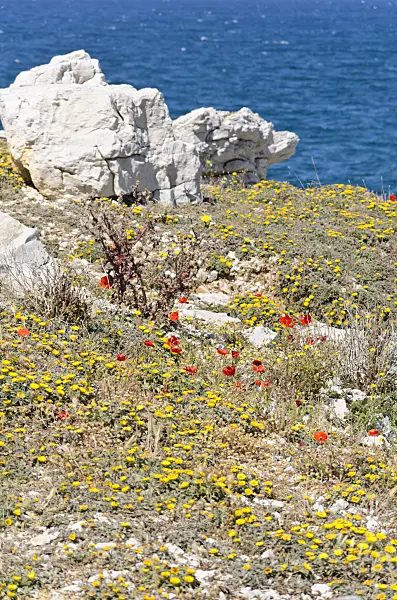 Küstenstrandstern (Asteriscus maritimus) und Klatschmohn (Papaver rhoeas)