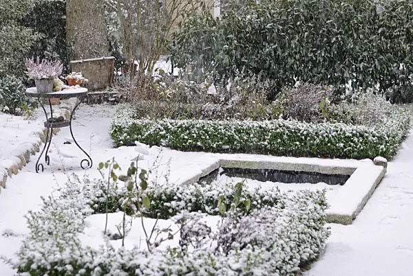 Formaler Garten mit Buchshecken und Wasserbecken im Schnee