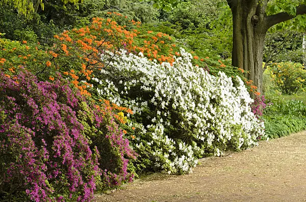 Azaleen (Rhododendron) und Europäischer Straußfarn (Matteuccia struthiopteris)