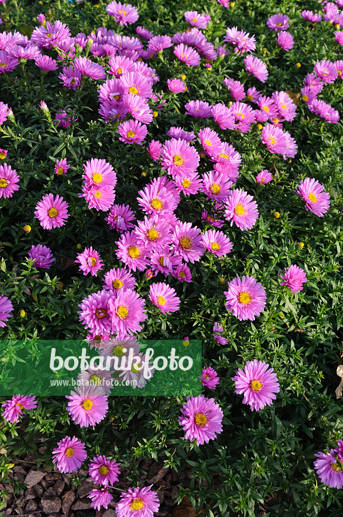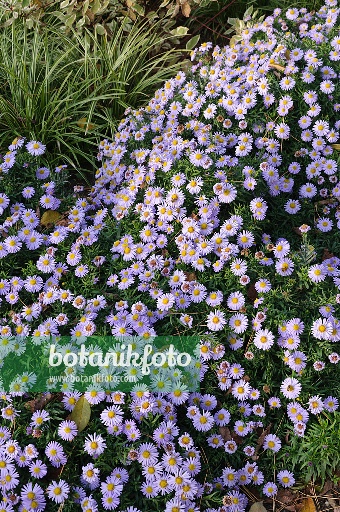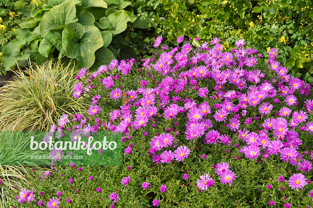 Astern (Aster) in einem herbstlichen Naturgarten mit Hochbeet