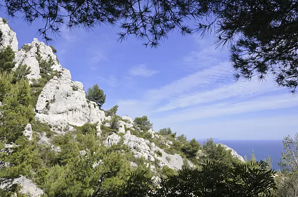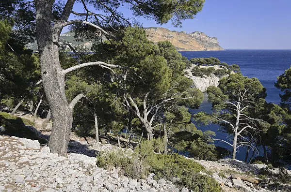 Aleppo-Kiefern (Pinus halepensis) an der Calanque de Port-Miou, Nationalpark Calanques, Frankreich