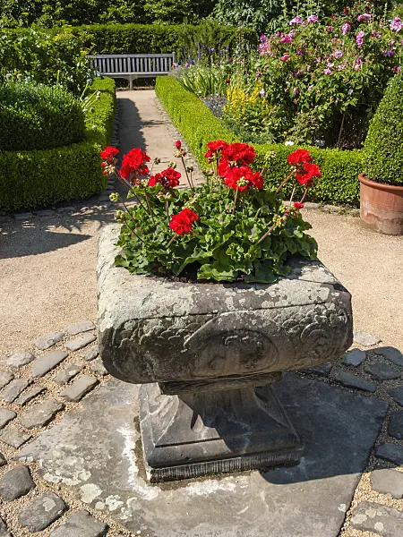 Palmen mit Steinskulpturen in einem Steingarten, Botanischer Garten, Singapur