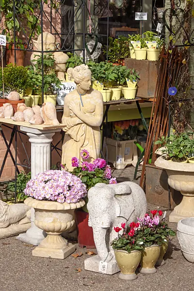 Blumengeschäft mit Pflanzen und Skulpturen