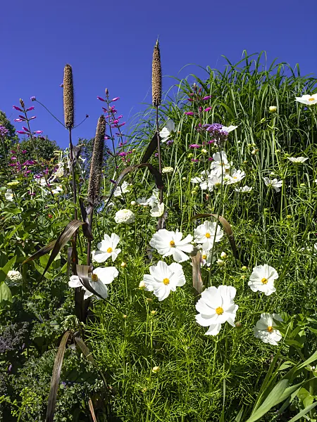 Gemeine Kosmee (Cosmos bipinnatus) und Perlhirse (Pennisetum glaucum 'Purple Majesty' syn. Pennisetum americanum 'Purple Majesty')